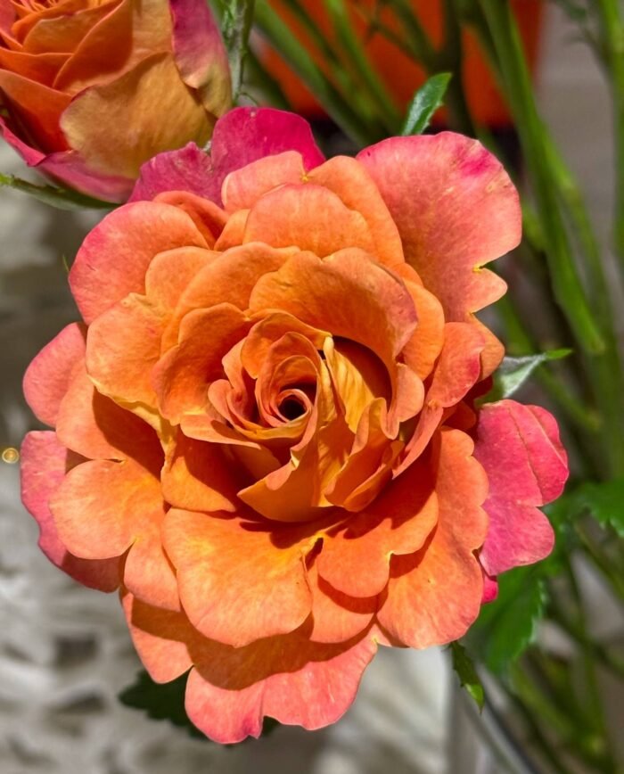The ‘Gypsy Curiosa’ rose is a unique Hybrid Tea with ruffled, orange-blend blooms that dramatically change color as they mature, starting marble red/orange-yellow and fading to pink, then white, and finally to green, offering a dynamic, multi-toned look in the garden and in arrangements. Known for its long vase life (14-18 days) and disease resistance, making it a popular, innovative choice for florists, it’s a hardy, flushes-throughout-the-season bloomer from the Netherlands, bred by De Ruiter around 2002, and thrives in warmer zones (7b-10).