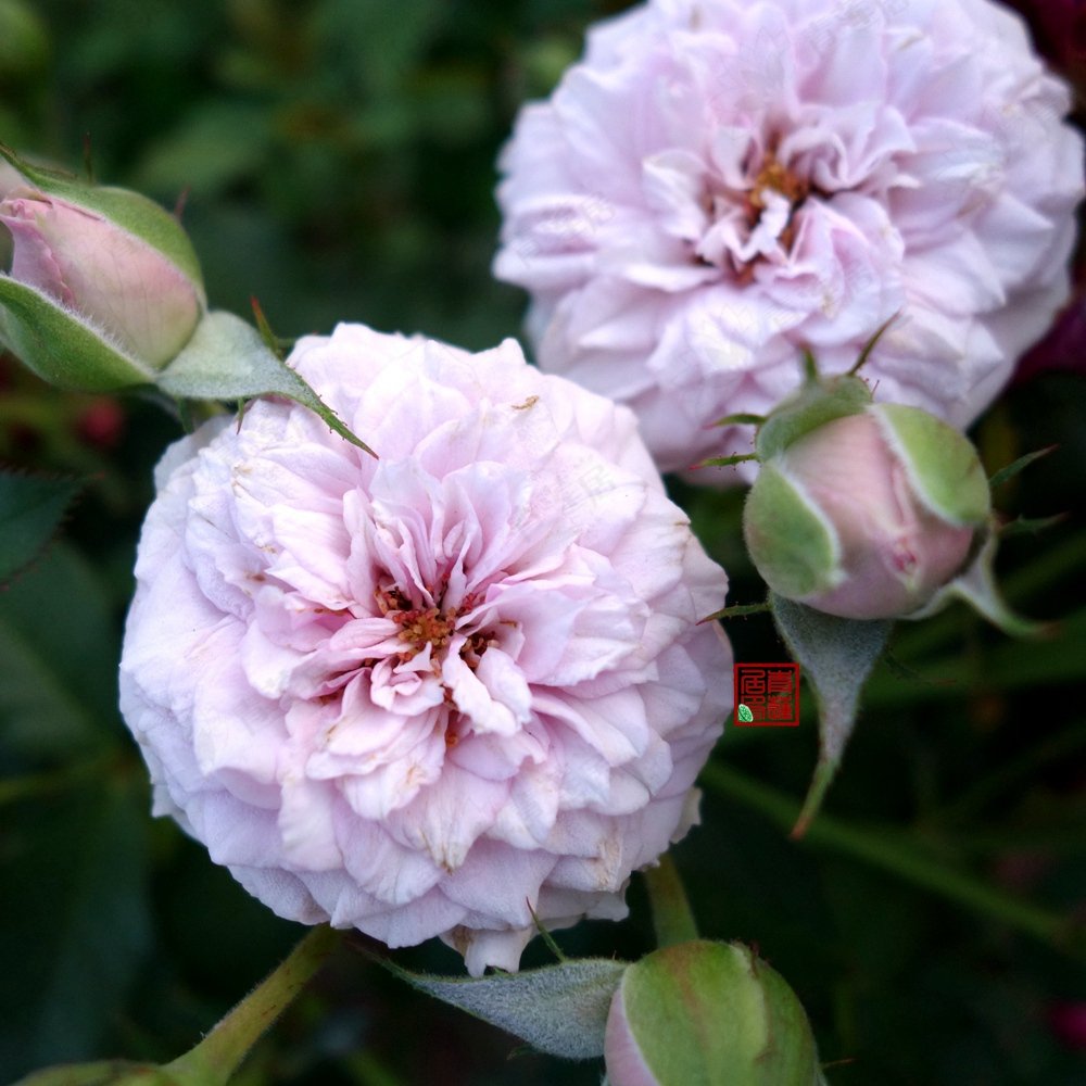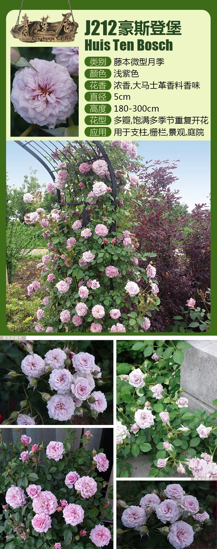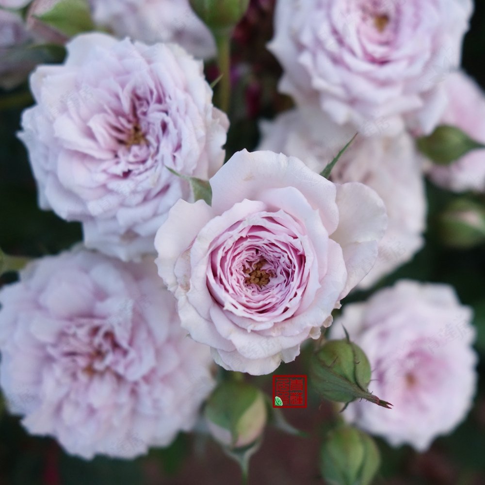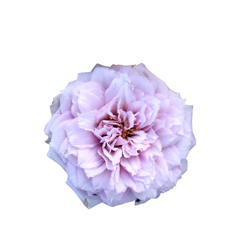 Lilac. Strong fragrance. Small, very full (41+ petals) bloom form. Blooms in flushes throughout the season.