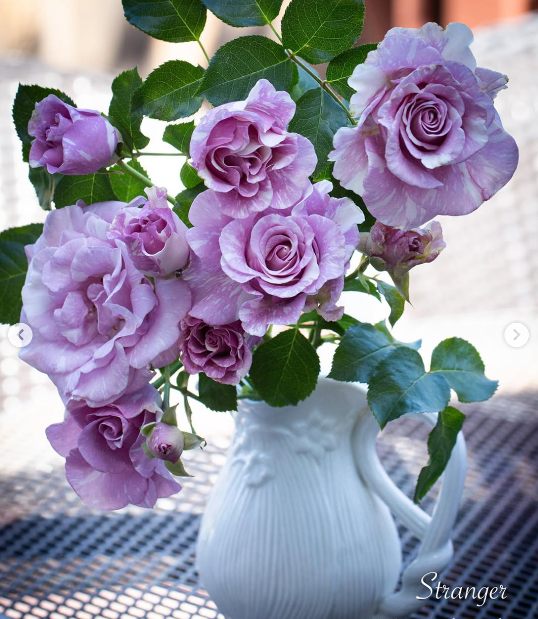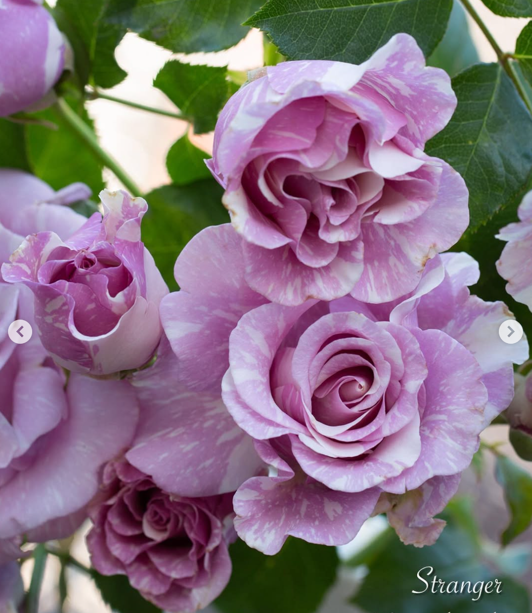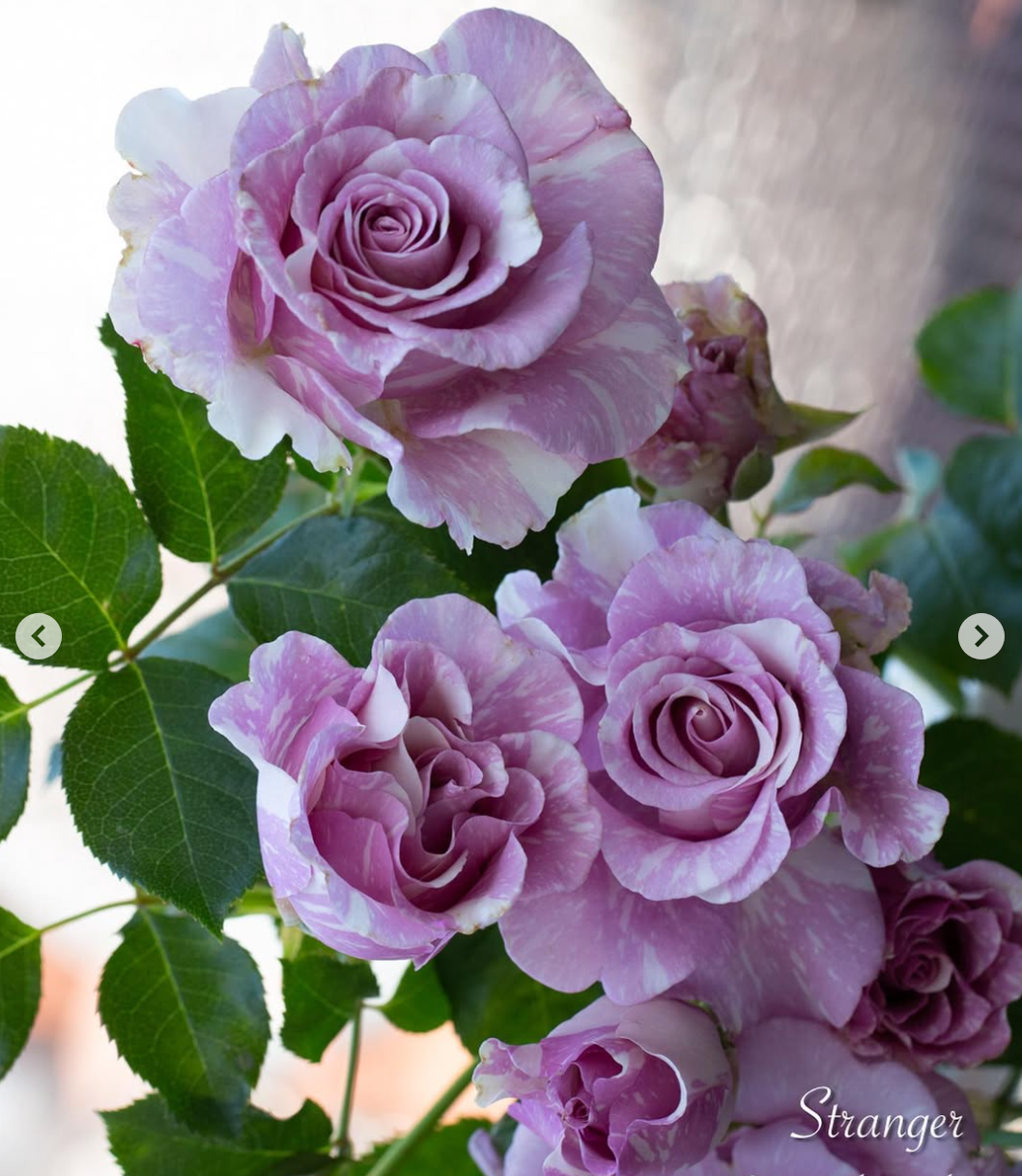 Stranger florist/hybrid tea rose bred by Olij Rozen B.V. (Netherlands) and introduced in the Netherlands (2000). The 3.5-inch purple blend, white streaks, stripes, flecks blooms have no fragrance. This rose has good health and blooms all the time